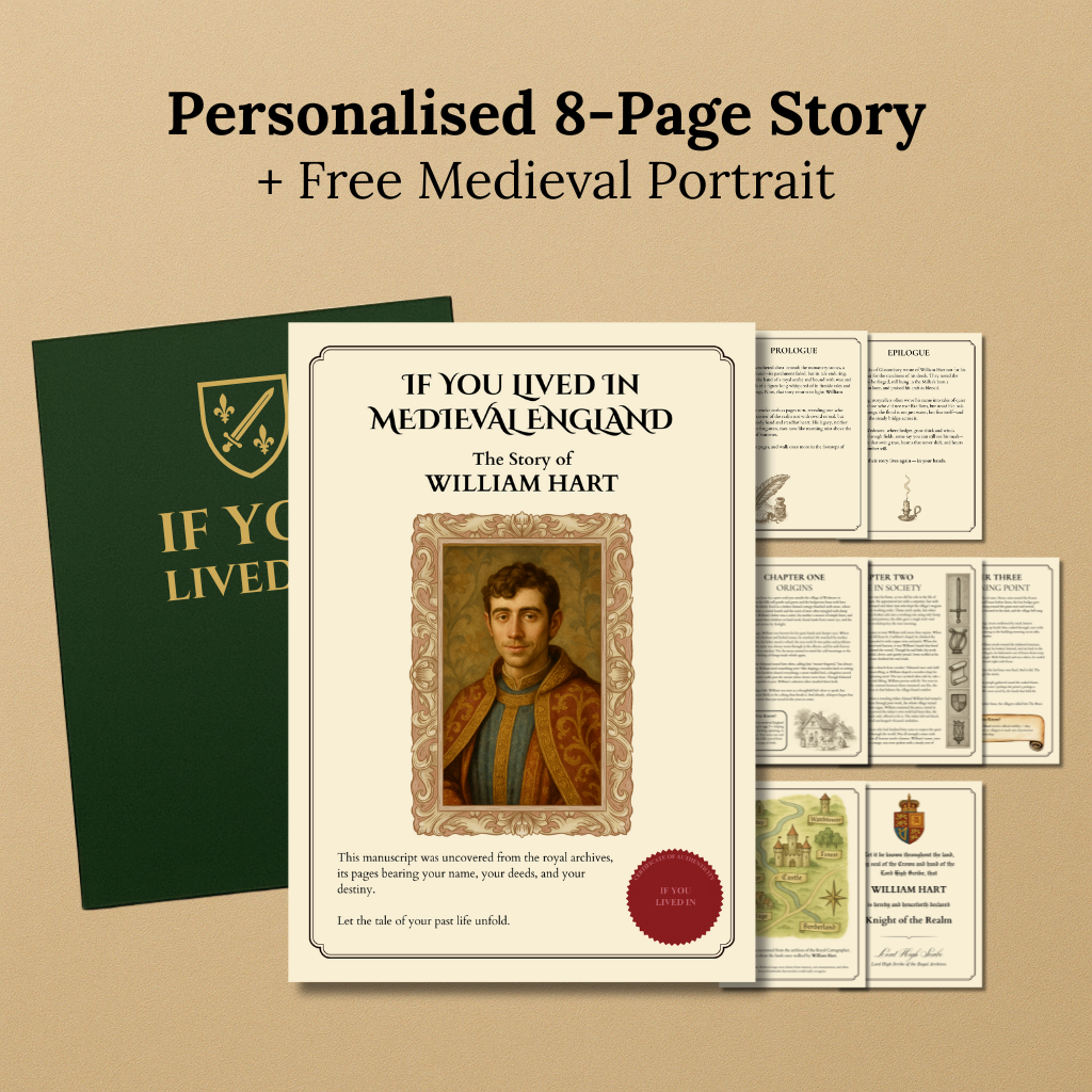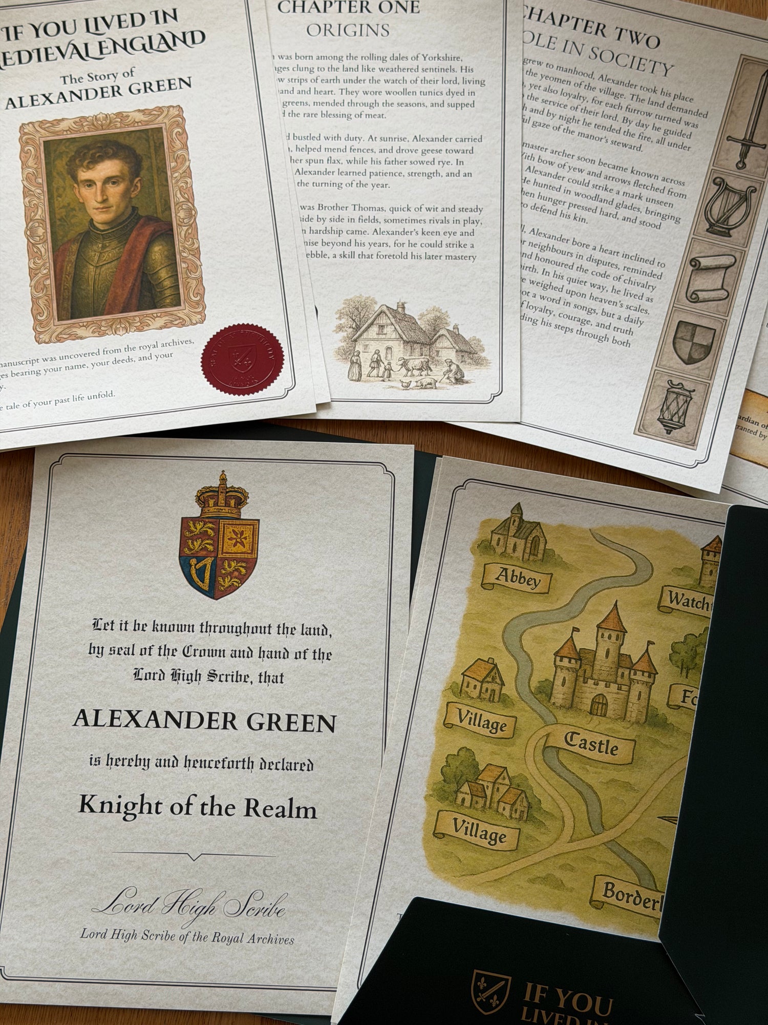 A personalised medieval story where you’re the hero — complete with a custom portrait, beautifully printed on parchment-style paper and housed in a premium presentation folder.